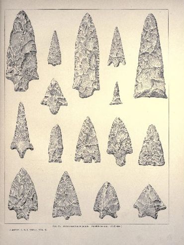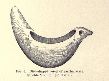 The sherds were decorated with a design, 9 earthenware vessels shaped like a bird, a toy vessel, 2 tobacco pipes, 12 polished hatchets, a celt, a chisel made of clay, 114 arrowheads and lance points, tubes of natural formation, double bladed axe, boat shaped pendant, lower jaw of a bear, and turkey leg and spur.